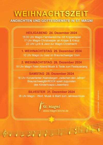 An Heiligabend, 24. Dezember, lädt die Braunschweiger Magni-Gemeinde kleine und große Menschen zum Krippenspiel und Weihnachtssegen in die Magni-Kirche am Ölschlägern ein. Krippenworte und den Weihnachtssegen spricht Magni-Pastor Henning Böger. Weitere Informationen zu den Magni-Angeboten rund ums Fest gibt es auf www.magni-kirche.de.