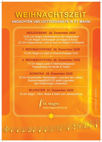 An Heiligabend, 24. Dezember, lädt die Braunschweiger Magni-Gemeinde kleine und große Menschen zum Krippenspiel und Weihnachtssegen in die Magni-Kirche am Ölschlägern ein. Krippenworte und den Weihnachtssegen spricht Magni-Pastor Henning Böger. Weitere Informationen zu den Magni-Angeboten rund ums Fest gibt es auf www.magni-kirche.de.