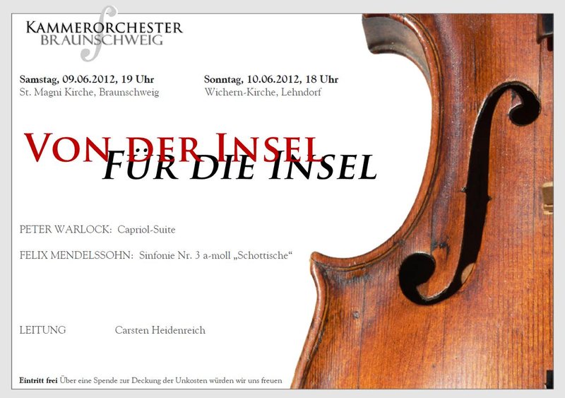 Am kommenden Sonntag, 09. Juni, konzertiert das Kammerorchester Braunschweig (Leitung: Carsten Heidenreich) wieder in der Magni-Kirche. Zu hören sind u.a. Peter Warlock, Capriol Suite, und Felix Mendelssohn-Bartholdy, Schottische Sinfonie Nr. 3 a-moll op. 56. Beginn des KOnzertes ist 19 Uhr. Der Eintritt ist frei. Spenden für die Orchesterarbeit sind erbeten. Das nächste Konzert des Kammerorchesters findet voraussichtlich im Herbst in St. Magni statt.