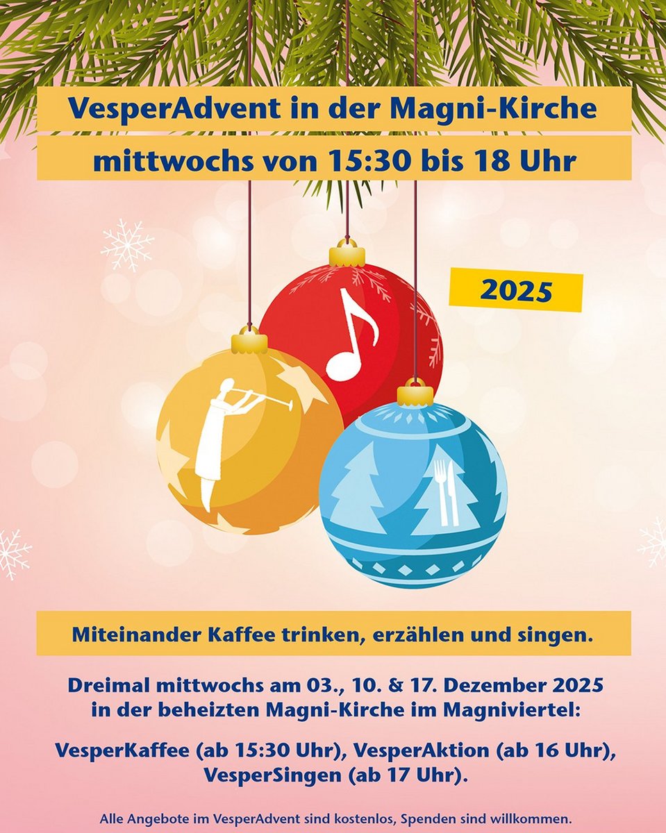 Dreimal mittwochs im Dezember lädt dann der VesperAdvent in die Magni-Kirche am Ölschlägern ein. Im geheizten Kirchenraum stehen wieder Gespräche an der Kaffeetafel, kreative Aktionen, wie eine Schreibwerkstatt für Weihnachtsgrüße, und ein offenes Adventssingen in Zusammenarbeit mit der Bürgerstiftung Braunschweig auf dem Vesperprogramm. Der VesperAdvent öffnet am 03., 10. und 17. Dezember zwischen 15:30 und 18 Uhr seine Türen in die Magni-Kirche. Die Teilnahme ist kostenfrei und ohne Anmeldung möglich. Herzlich willkommen an St. Magni!